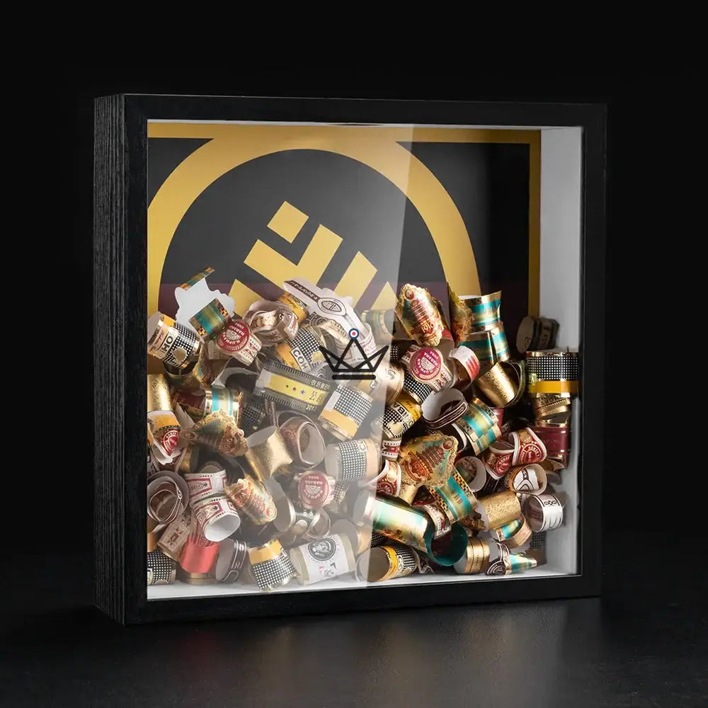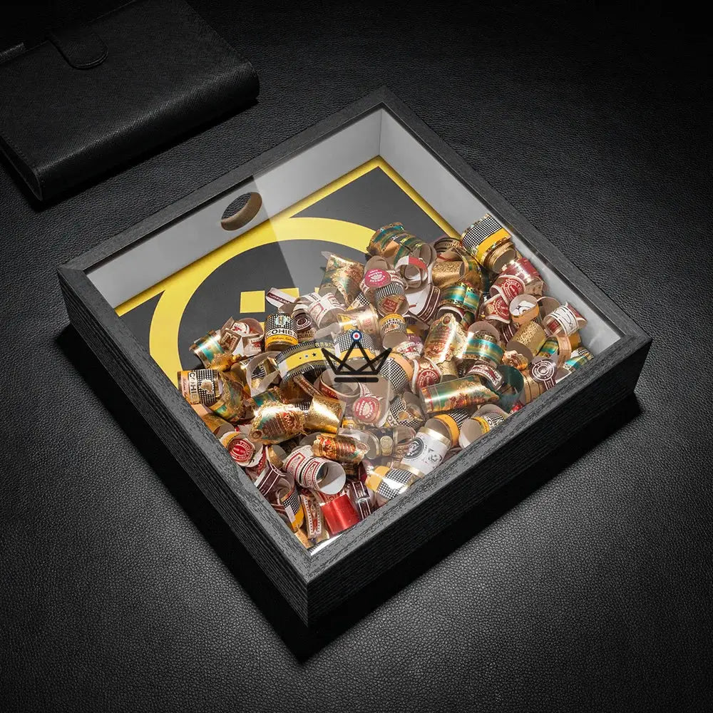Découvrez le Présentoir à Bagues de Cigare - Square Ring, un cadre décoratif sophistiqué conçu pour les passionnés de cigares qui souhaitent mettre en valeur leur collection de bagues de cigare fumées.