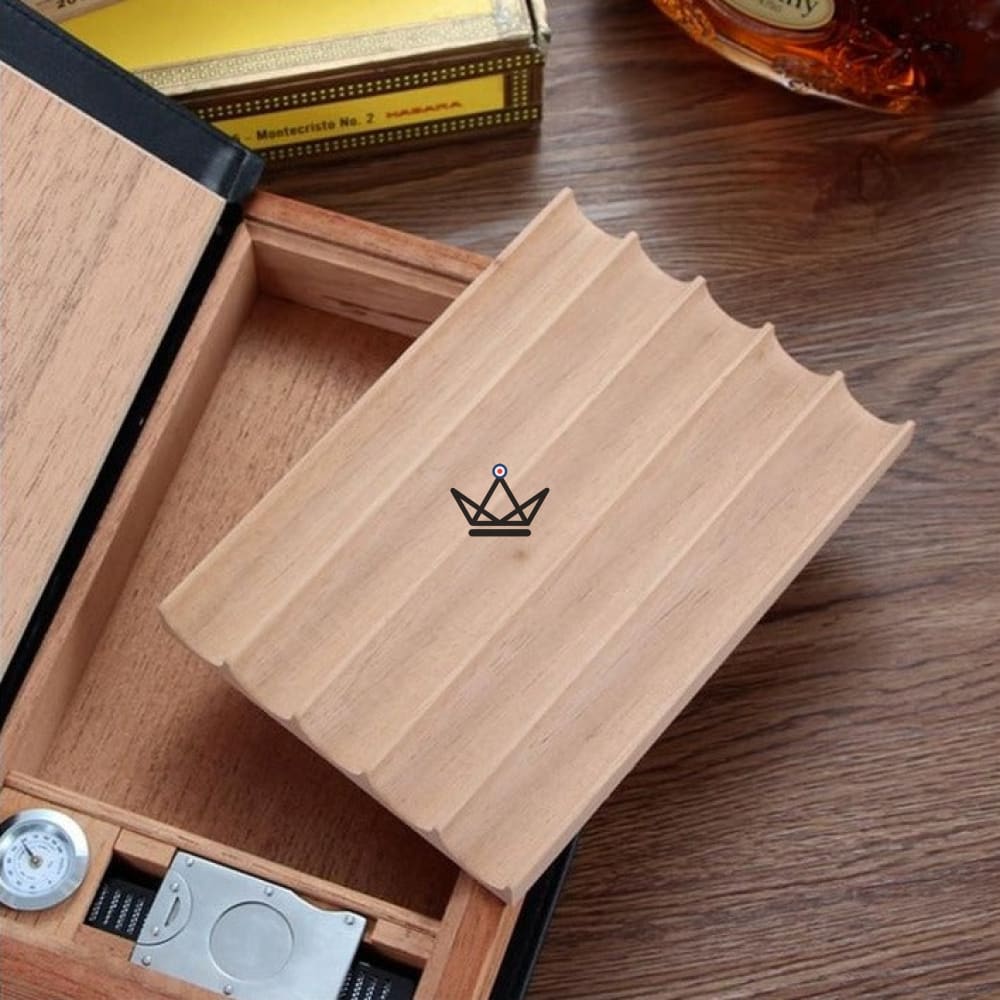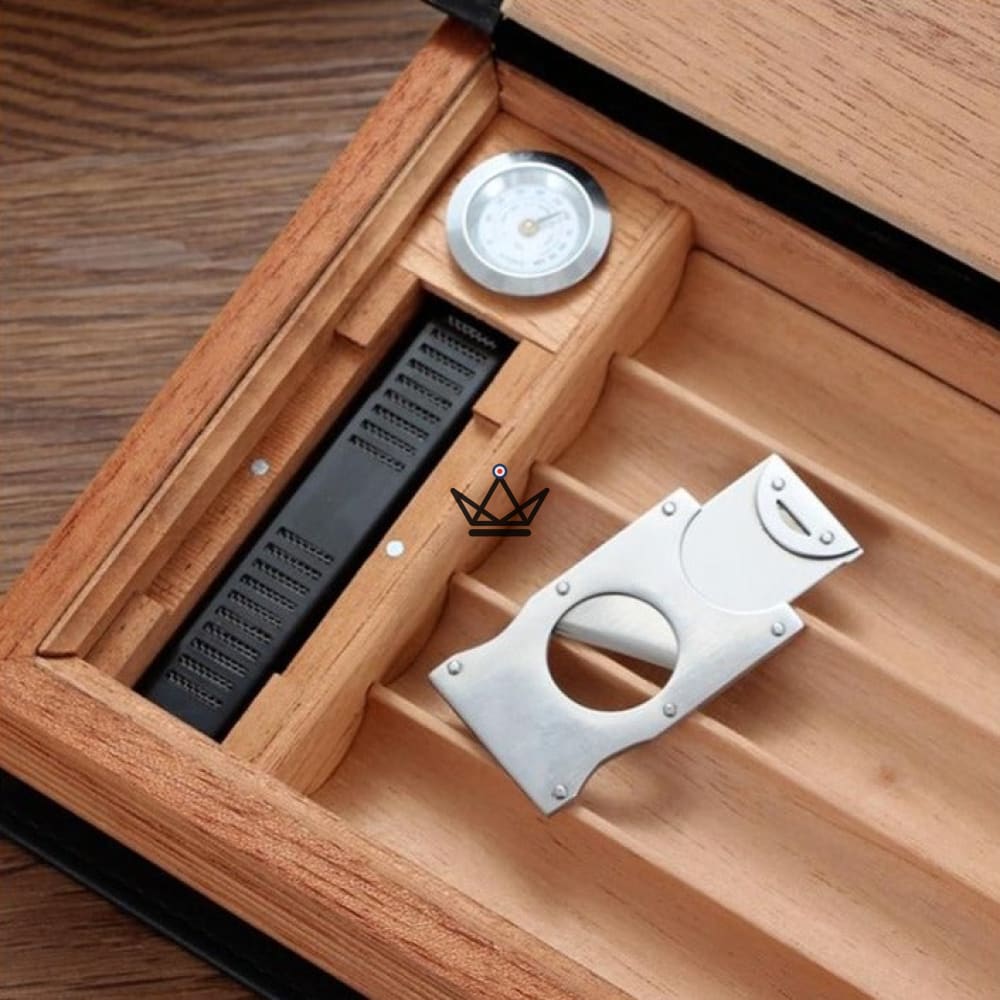 Elle est fournie avec un hygromètre, un coupe cigare, un humidificateur, une pipette de dosage et un gabarit pour 5 cigares.