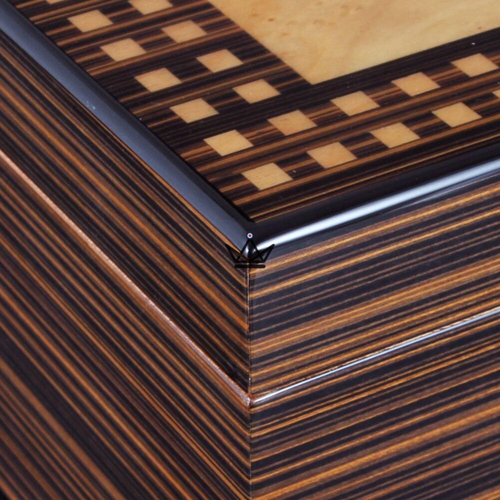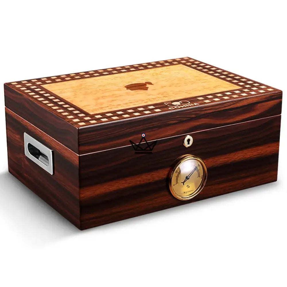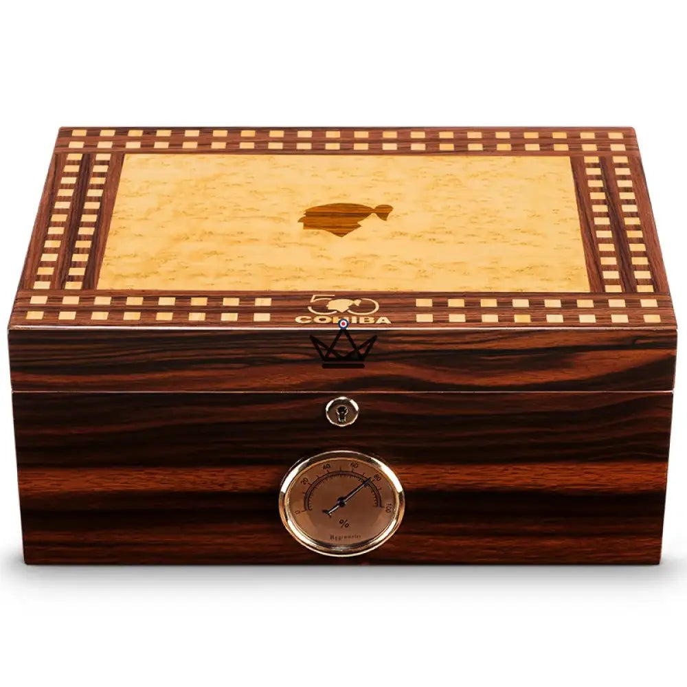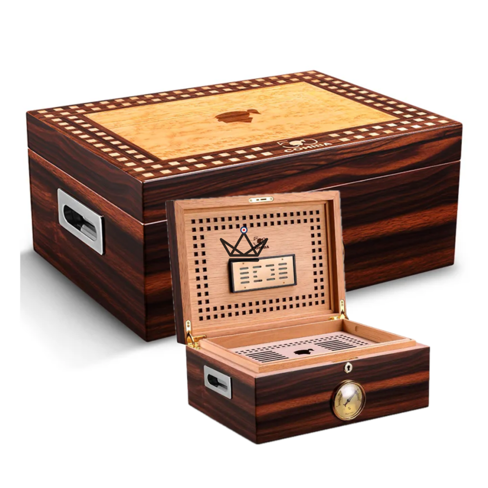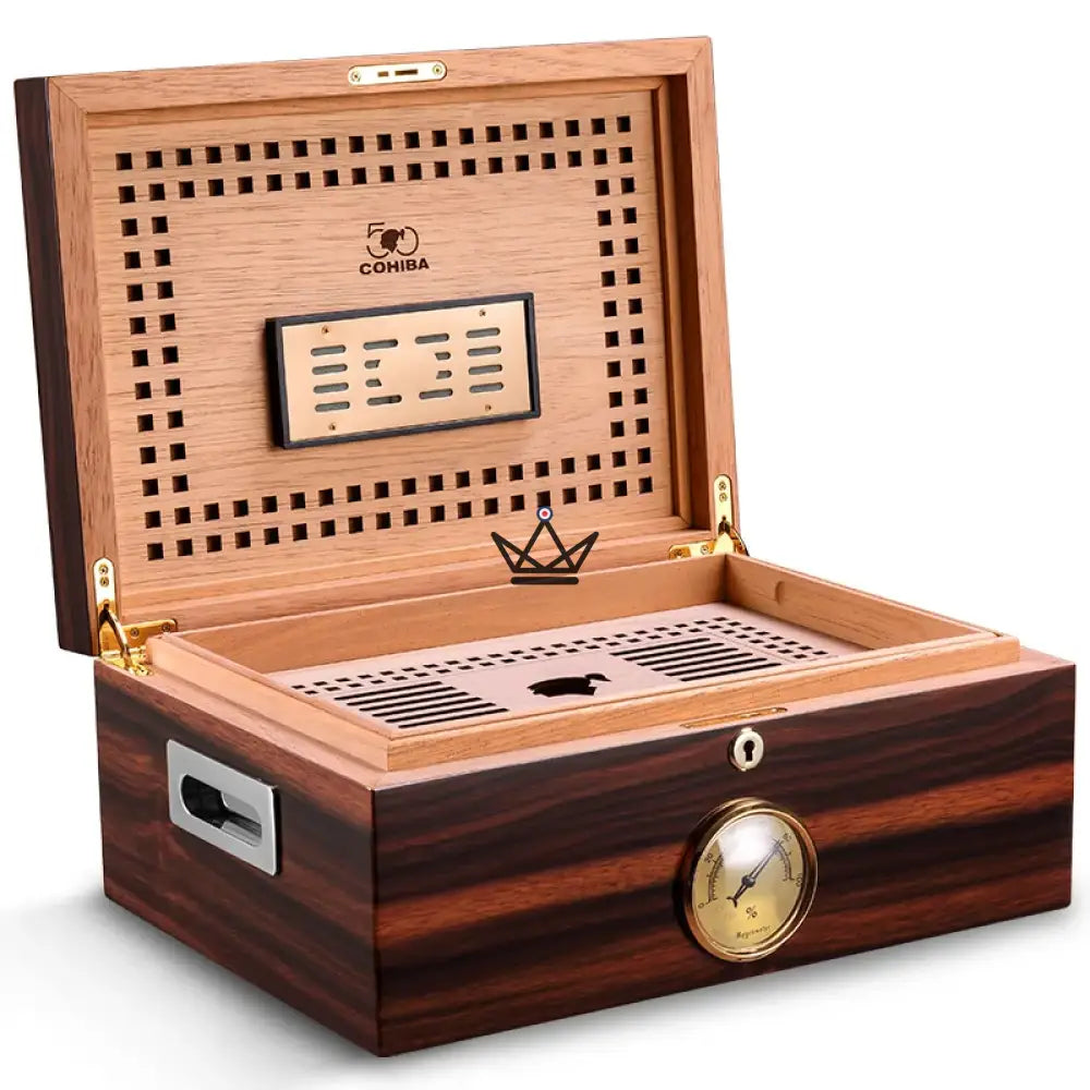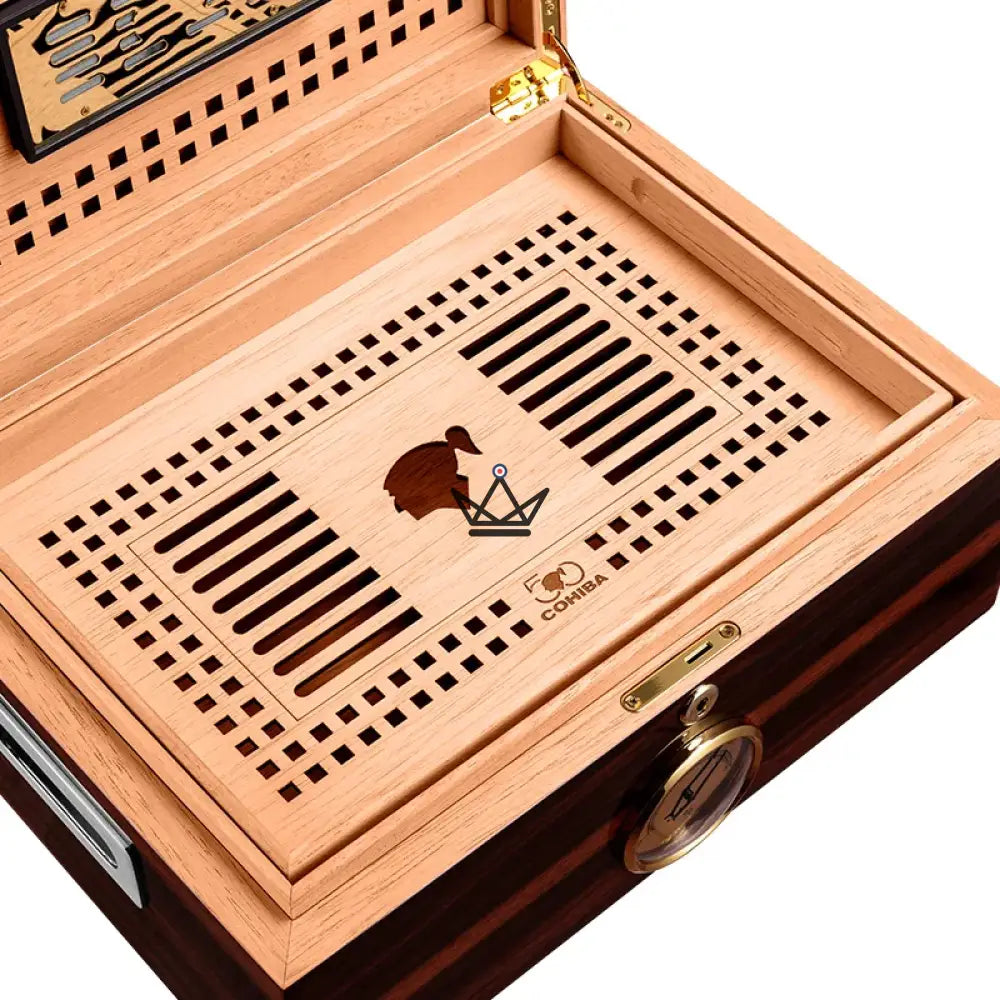 Conçue avec soin, la cave est dotée d'un intérieur en bois de cèdre espagnol, sélectionné pour ses qualités d'humidification naturelles, qui aide à maintenir une humidité constante et préserve l'intégrité de chaque cigare Cohiba, Romeo y Julietta... Au cœur de cette expérience sensorielle se trouve un hygromètre précis, délicatement encastré sur la face avant, permettant de surveiller l'humidité à tout moment sans perturber la quiétude de vos cigares.