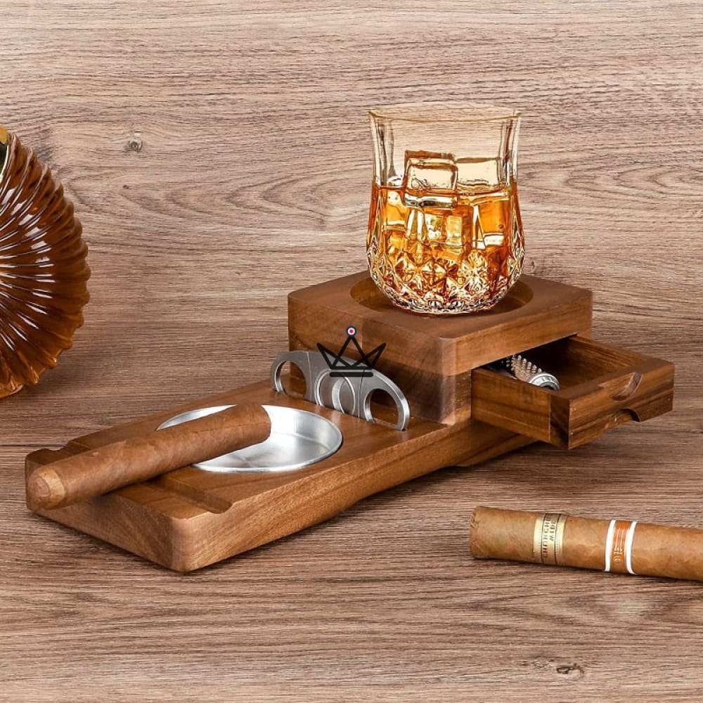 Fabriqué en bois massif, ce cendrier est équipé d'un sous-verre et d'un plateau à whisky pour profiter de votre boisson favorite tout en dégustant votre cigare.