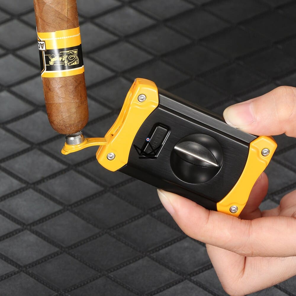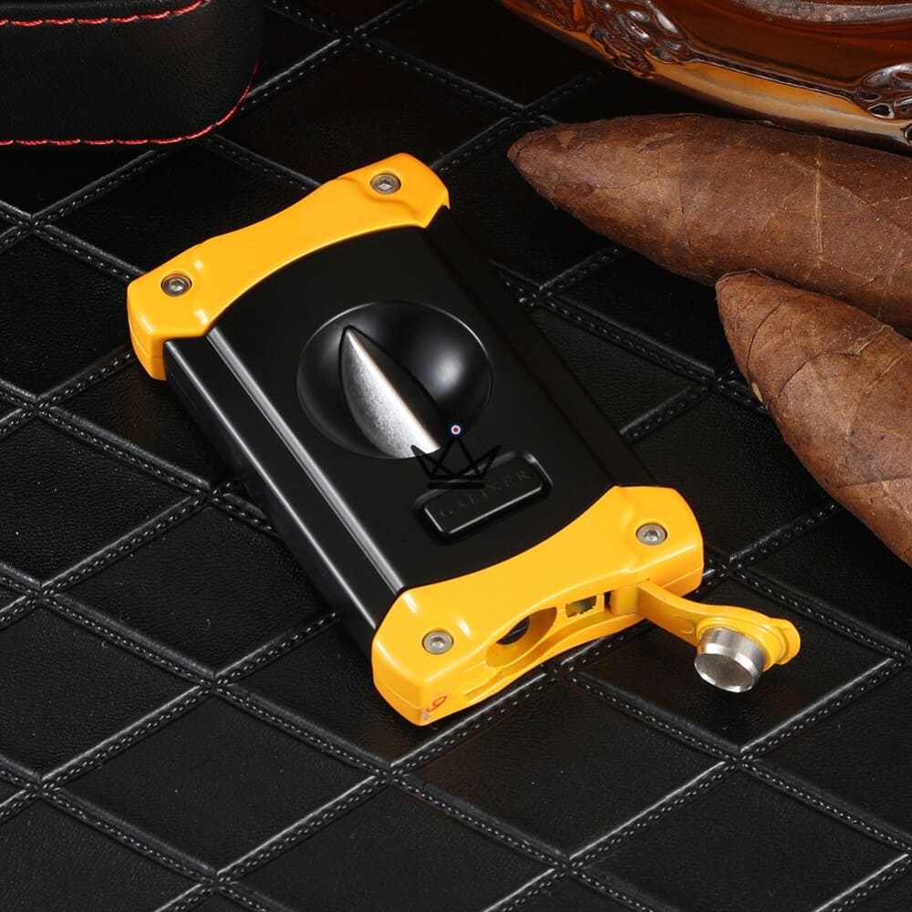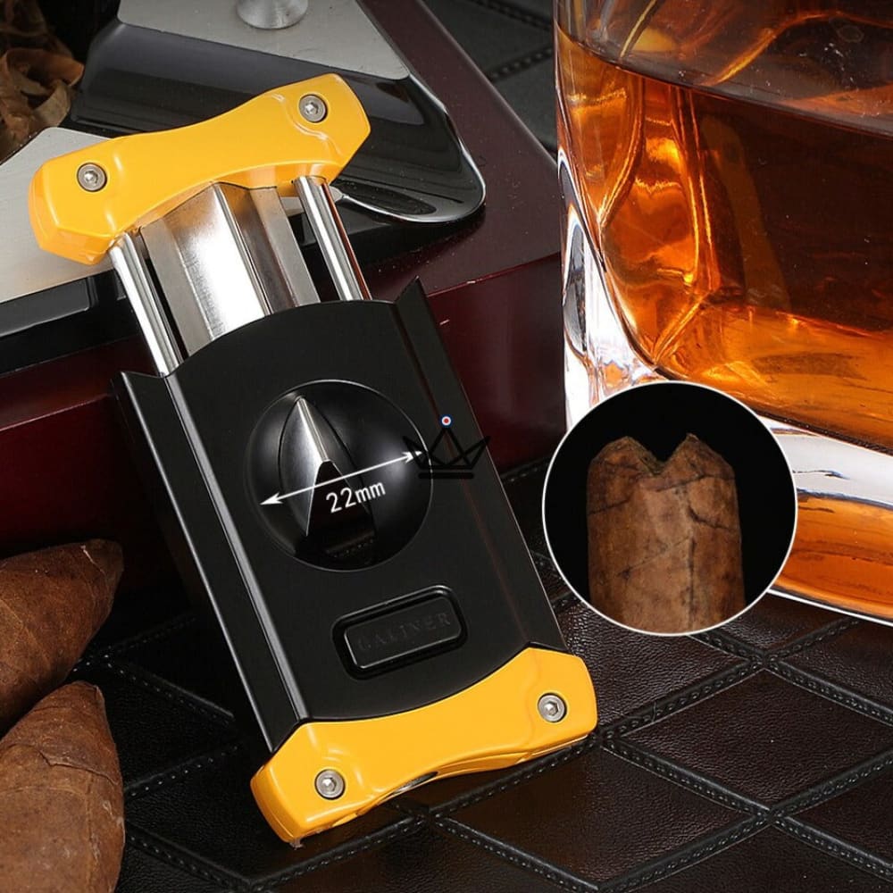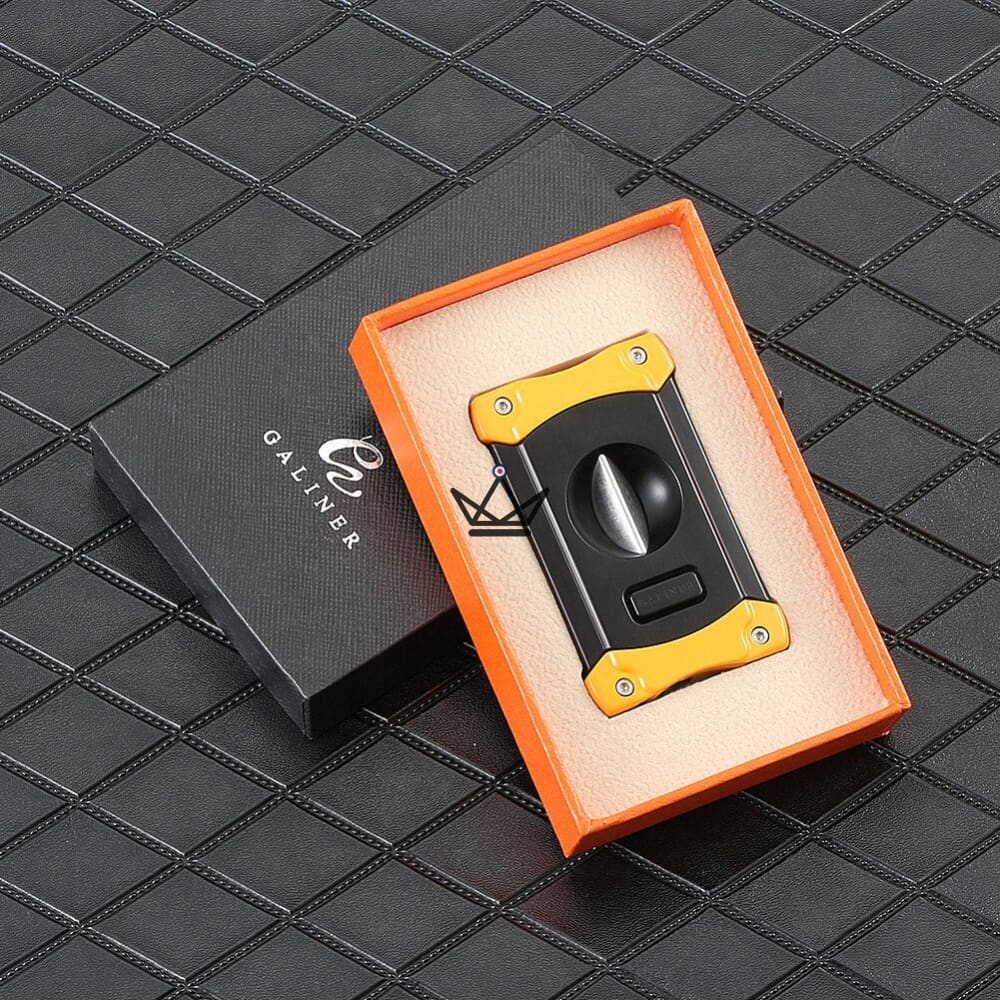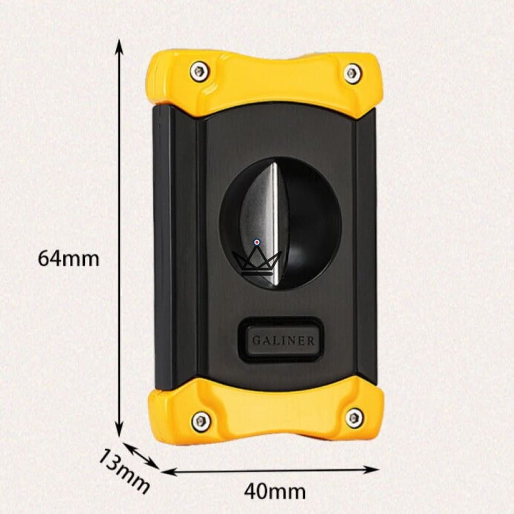 Der schlanke schwarze Körper des Zigarrenschneiders ist mit leuchtend goldenen, gelben oder roten Rändern akzentuiert und verleiht Ihrem Zigarrenverkostungserlebnis einen Hauch von Raffinesse und Eleganz.