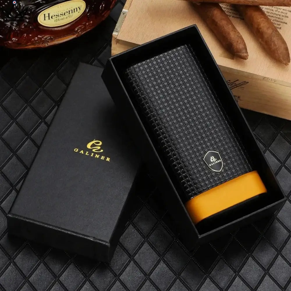 Mit seinem Fassungsvermögen für drei Zigarren ermöglicht Ihnen dieses Etui den Transport und Schutz Ihrer Lieblings-Cohiba-Zigarren mit Stil und Eleganz. Der untere Teil des Gehäuses ist gelb gefärbt, während der obere Teil schwarz gefärbt ist, wodurch ein attraktiver Kontrast entsteht.