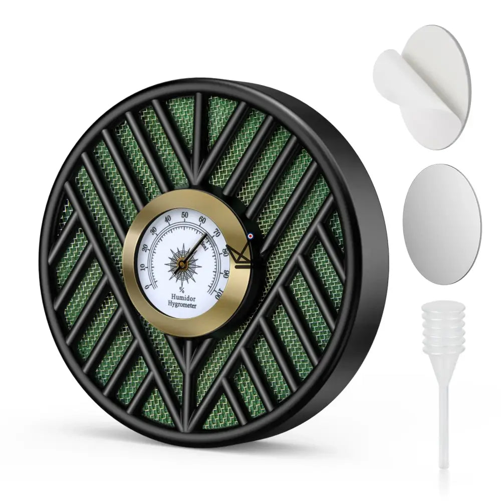 Mit einem kompakten Design von 9,5 cm Durchmesser und 3,9 cm Tiefe passt der Oasis Vortex perfekt in jeden Humidor. Es wird mit einem magnetischen Befestigungssystem und einem Magneten für eine einfache und effiziente Installation geliefert. Darüber hinaus ist doppelseitiges Klebeband für mehr Flexibilität bei der Installation im Lieferumfang enthalten. Seine solide Struktur aus PVC und Polymerschwämmen sorgt für eine lange Lebensdauer.