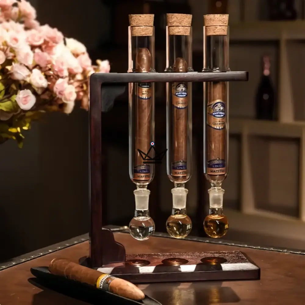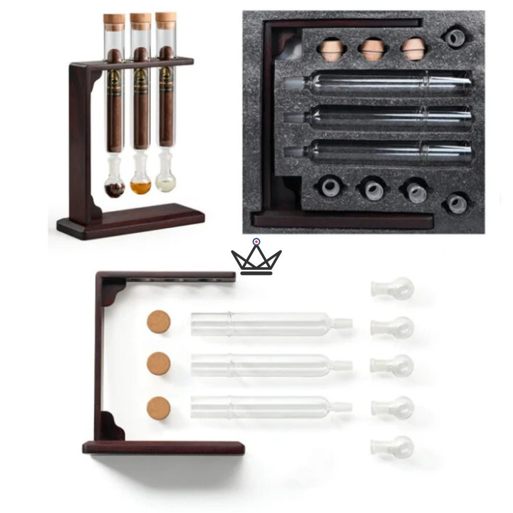 Der Infusio Trident ist weit mehr als nur ein Accessoire: Er bietet ein einzigartiges Geschmackserlebnis für Kenner edler Zigarren. Dank seiner drei vertikalen Borosilikatglasröhrchen , die an einem eleganten roten Holzsockel befestigt sind, ermöglicht dieser Infuser die gleichzeitige, sichere und diskrete Aromatisierung von bis zu drei Zigarren .