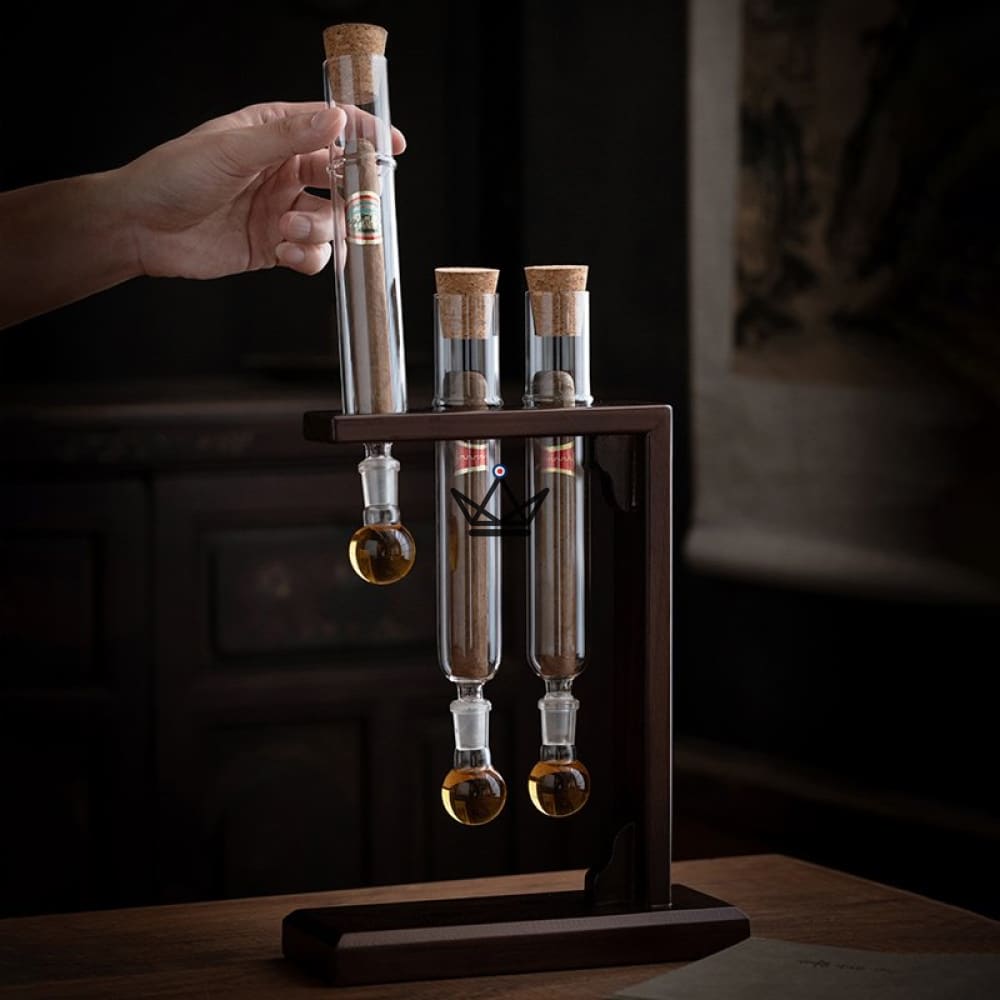 Legen Sie einfach je eine Zigarre in ein Glasröhrchen und füllen Sie den unteren Behälter mit Aromaflüssigkeit (Alkohol, Honig, Kaffee usw.). Die Aromen steigen sanft auf und parfümieren die Zigarre ohne direkten Kontakt.