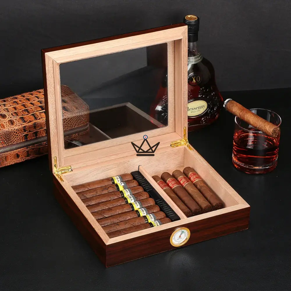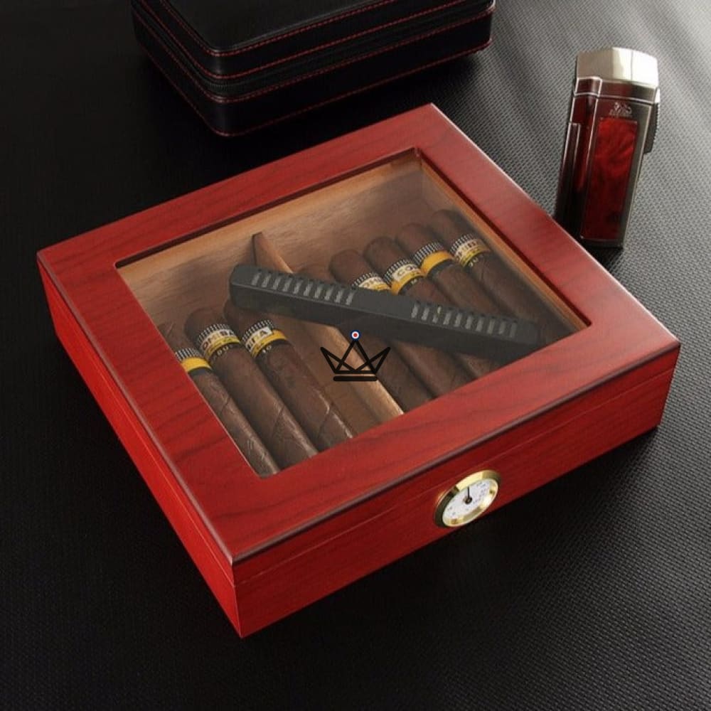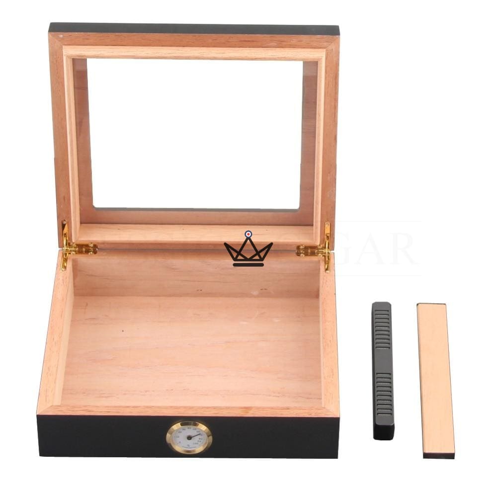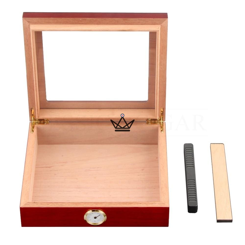 Ihr modernes Design mit Zedernholz an jeder Seite und einem Fenster an der Oberseite macht diese Zigarrenkiste einzigartig und originell.