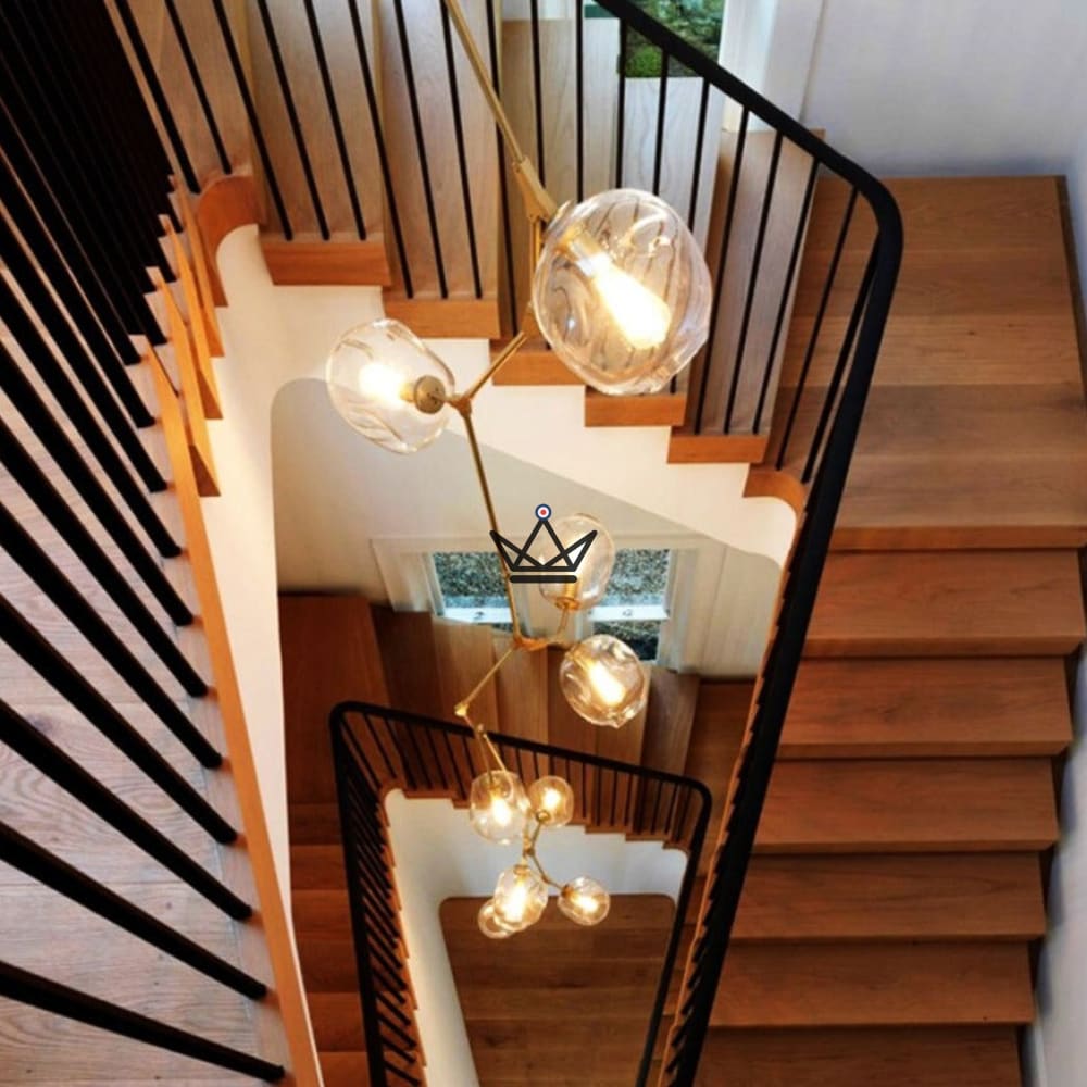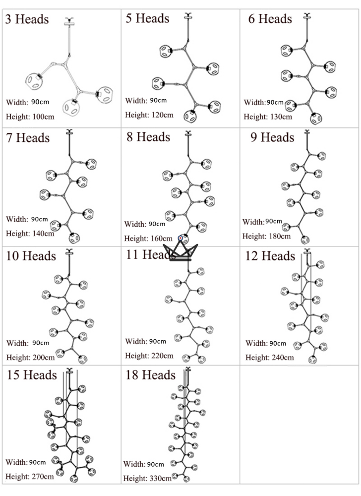 Die Breite bleibt konstant bei 90 cm, während die Höhe von 100 cm beim 3-Kugel-Modell bis zu 330 cm beim imposanten 18-Kugel-Modell variiert, sodass sich dieser Kronleuchter an Decken unterschiedlicher Höhe anpassen lässt.