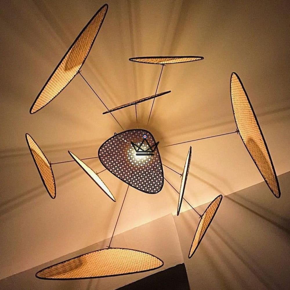 This majestic SCREEN Rattan decorative cane chandelier is the centerpiece of your interior decoration. Made of handmade rattan screens, it is mounted on a black metal frame like a mobile, creating an illusion of lightness and movement.