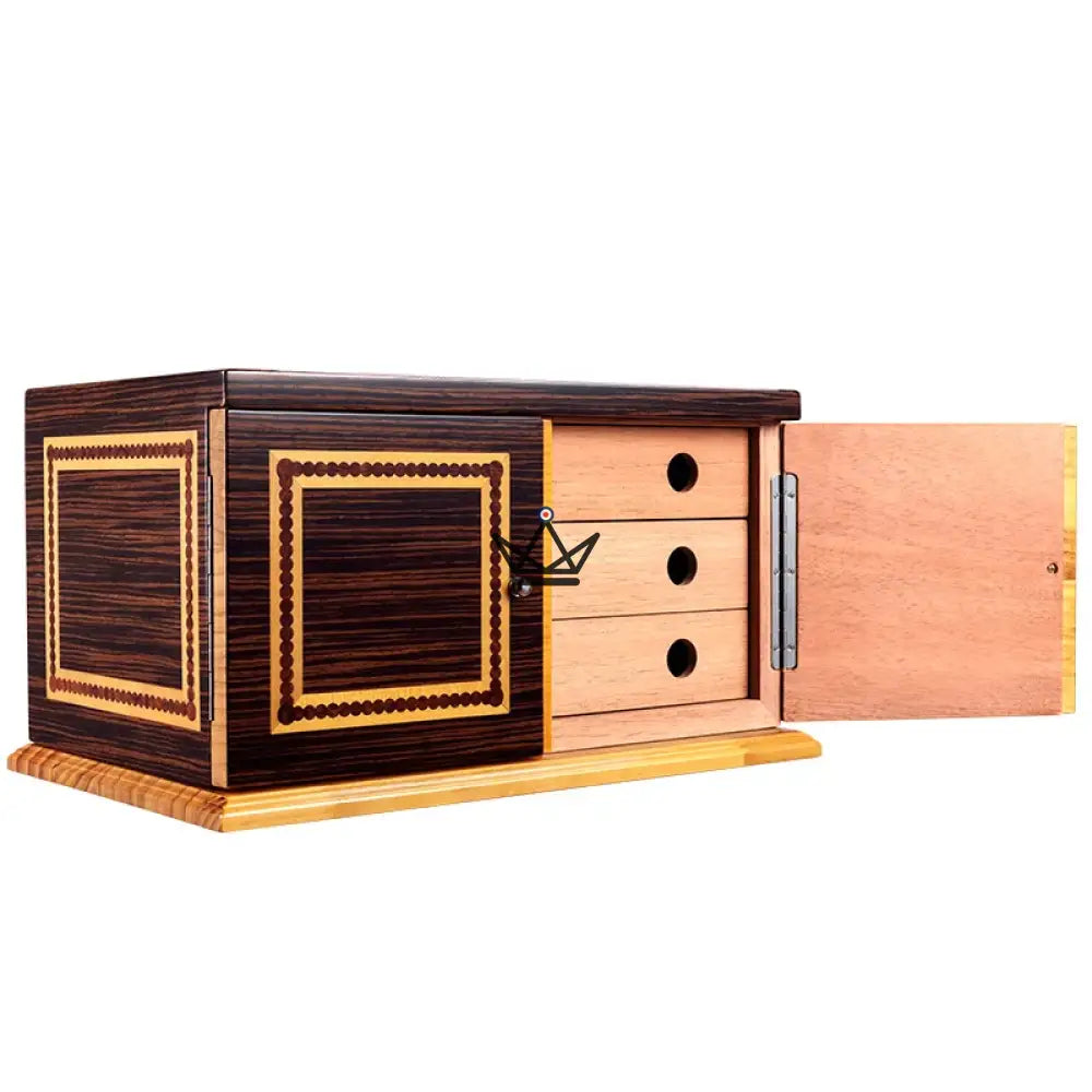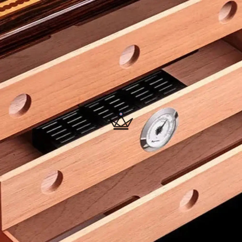 Optimal Preservation : The interior is equipped with a built-in hygrometer and humidifier , ensuring constant humidity control to ensure optimal preservation of your cigars. The generous capacity of this cabinet allows you to store a wide variety of cigars while maintaining the ideal conditions to preserve their quality and flavor.