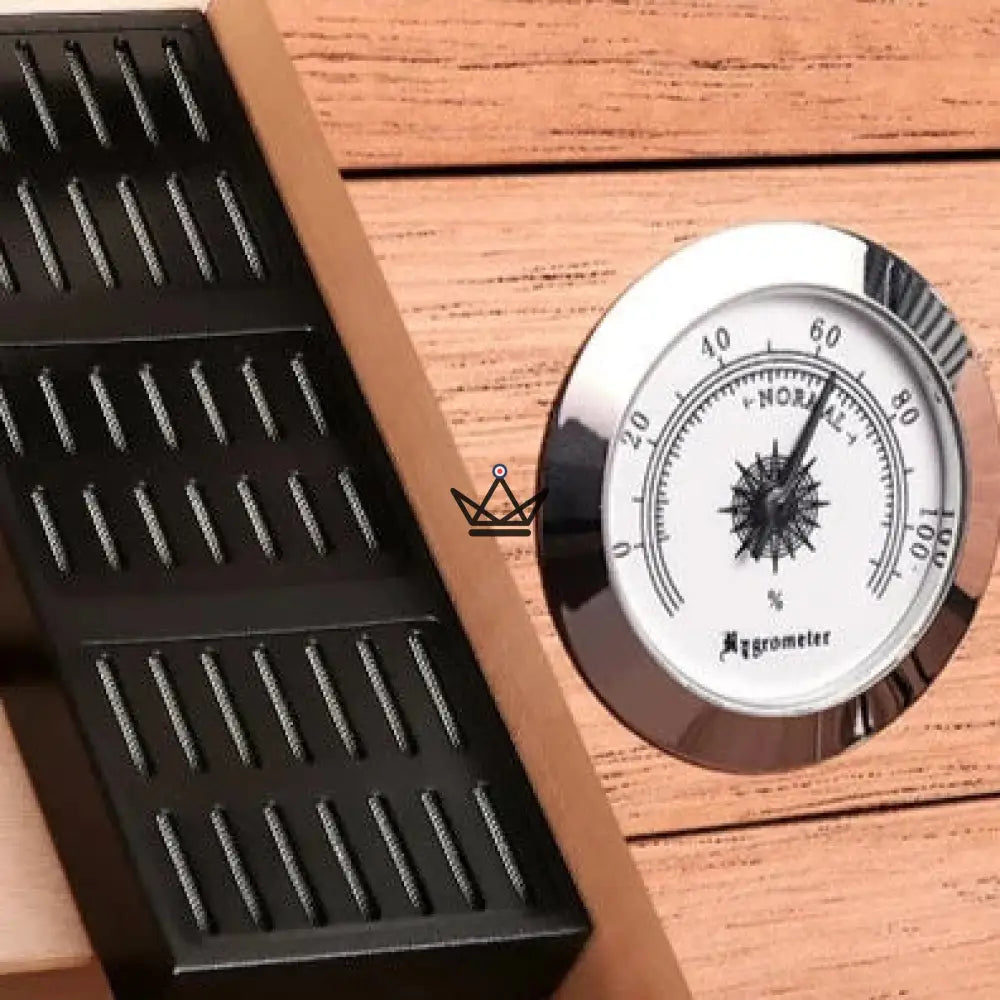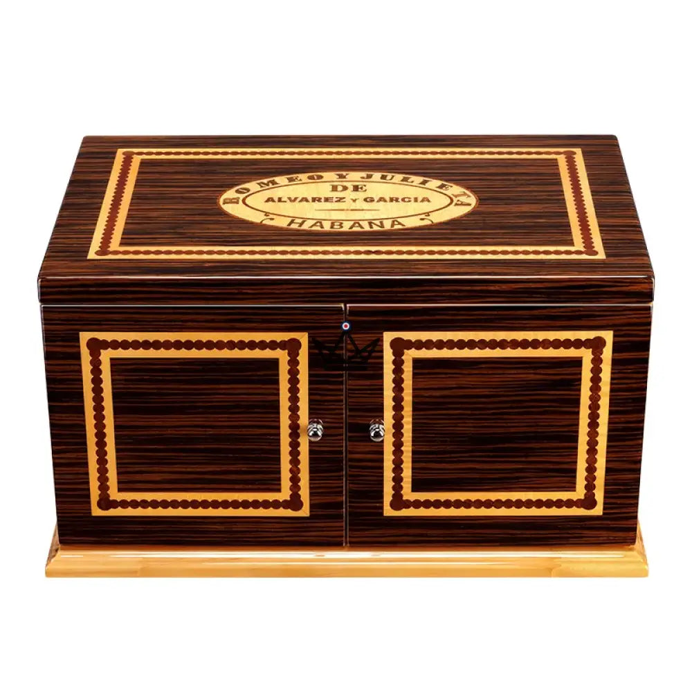 Inside, you will find a perfectly controlled environment, thanks to the integrated hygrometer and humidifier , guaranteeing a stable humidity to preserve the quality and aroma of your precious cigars. The layout of the compartments is designed for optimal organization, allowing you to store your Romeo y Julieta cigars with distinction and ease.